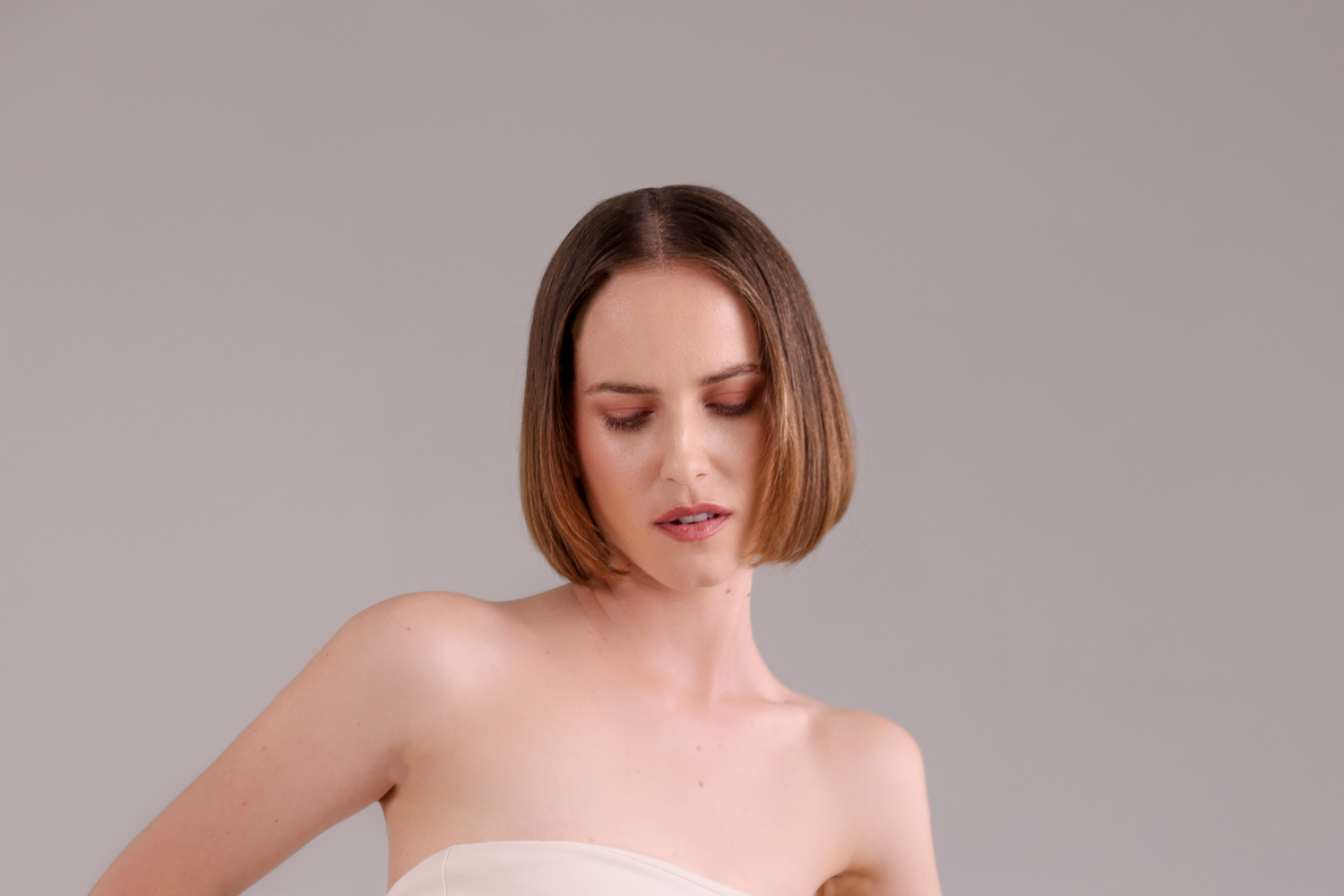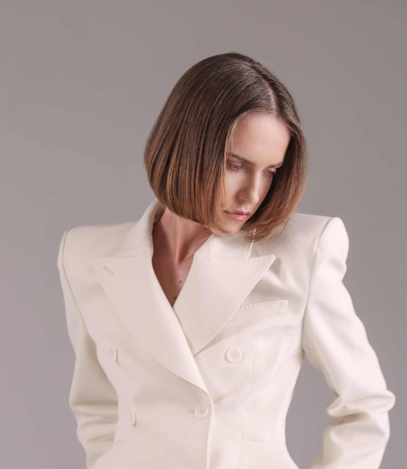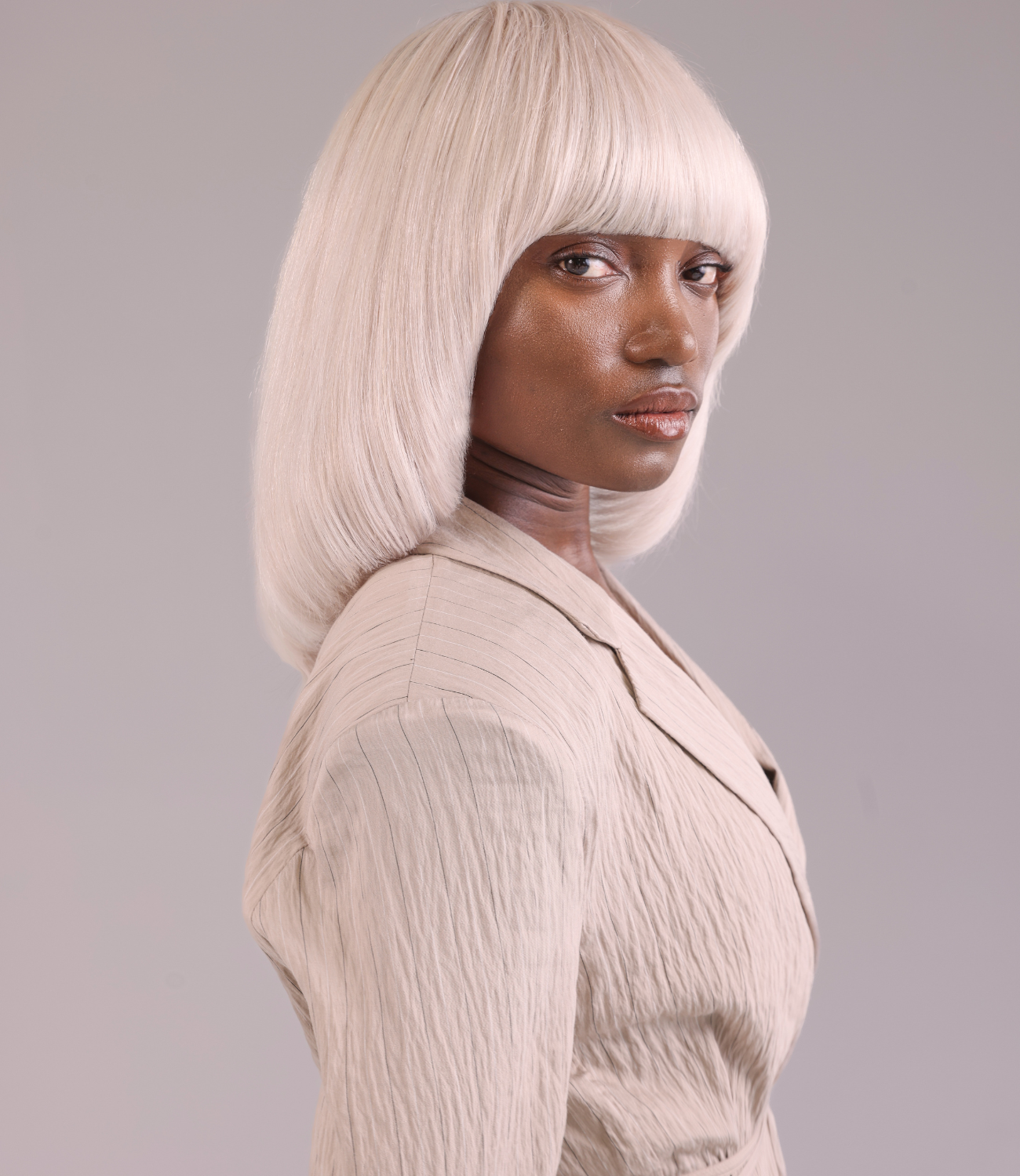 Ein Look, der durch seine klare Form und fließende Bewegung eine fast grafische Eleganz entfaltet. Das Haar schmiegt sich sanft ans Gesicht, fällt mit subtiler Innenbewegung und formt eine Silhouette, die zugleich weich und skulptural wirkt. Die sehr lange Ponypartie lenkt den Blick, setzt ein selbstbewusstes Statement und bringt Spannung und Charakter in den Look.