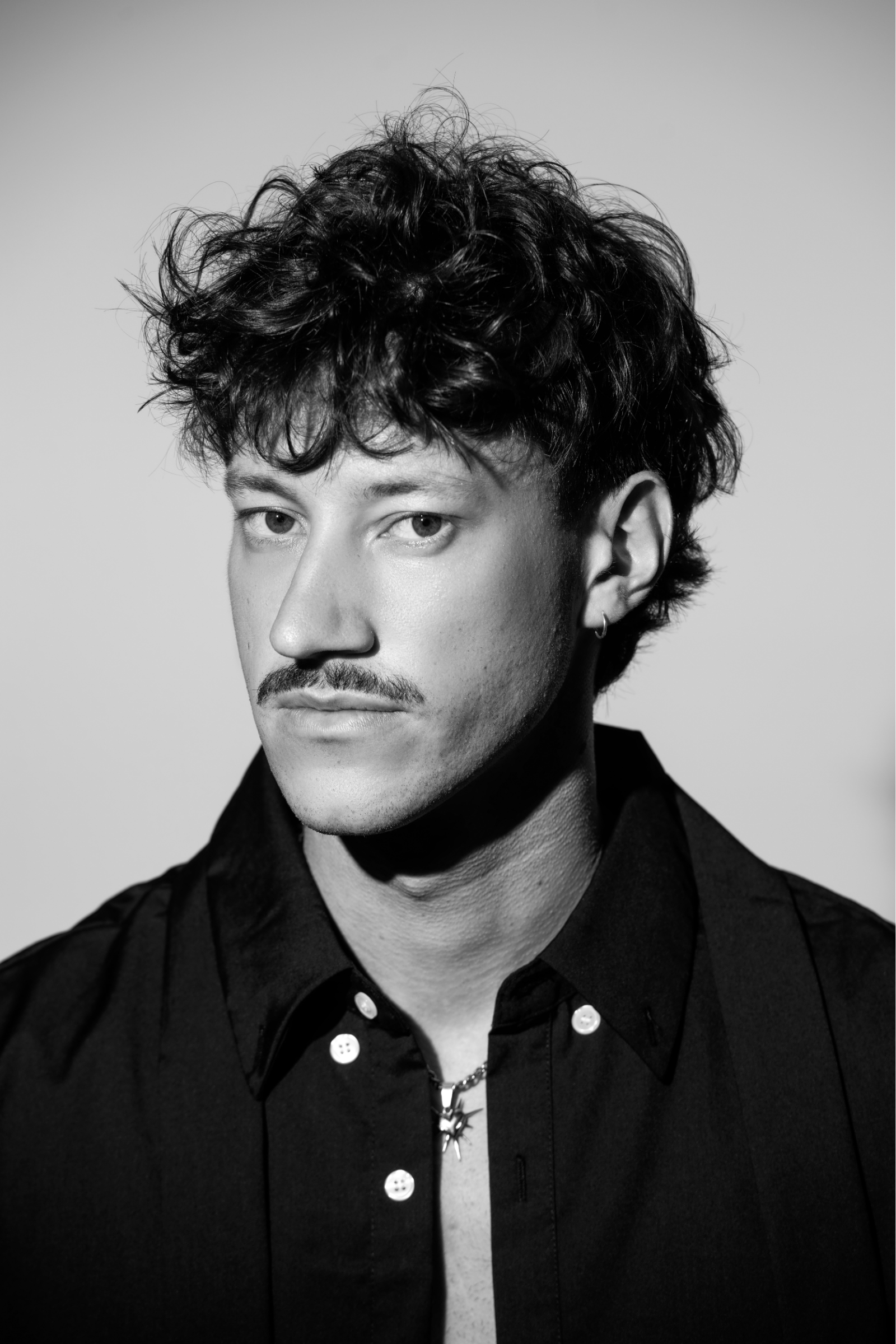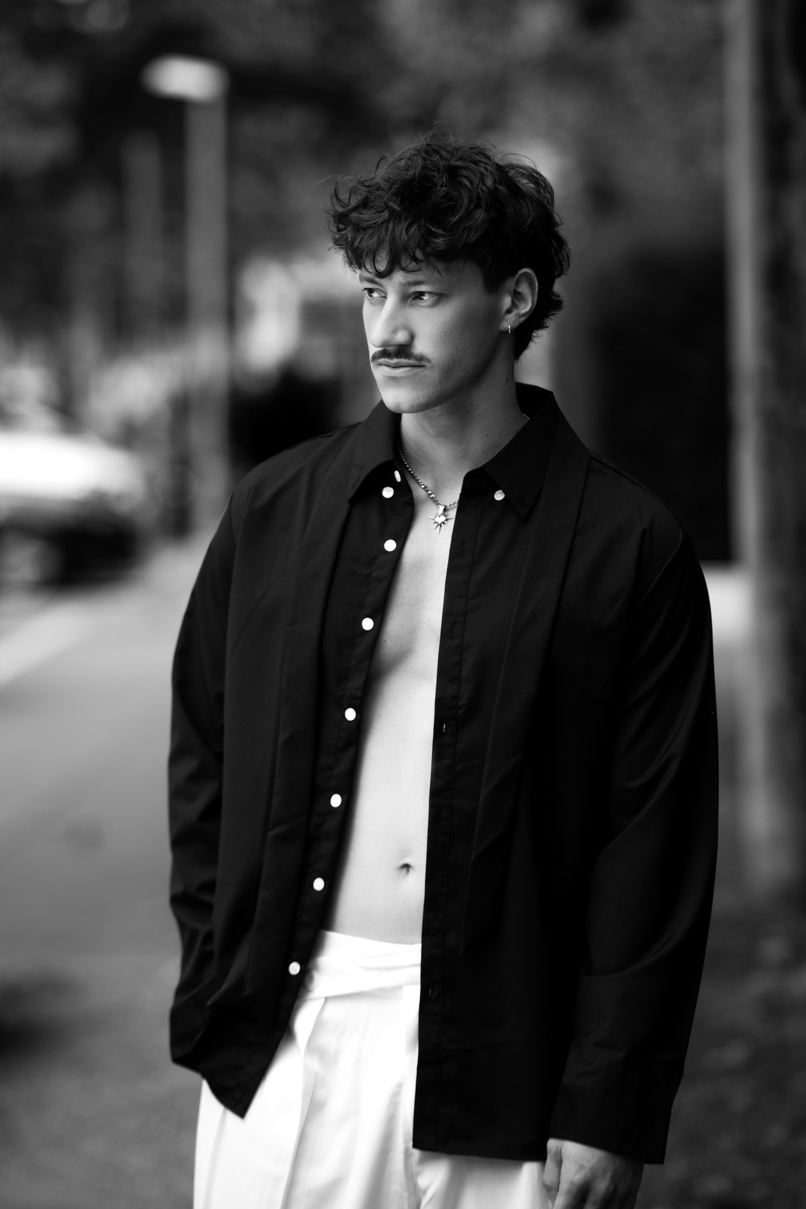 Der calligraphierte Männerlook besticht durch seine strukturierte Textur. Der Look ist angelehnt an den Mullet - voluminös am Oberkopf und locker an den Seiten, sorgt er für einen selbstbewussten, modernen Ausdruck.